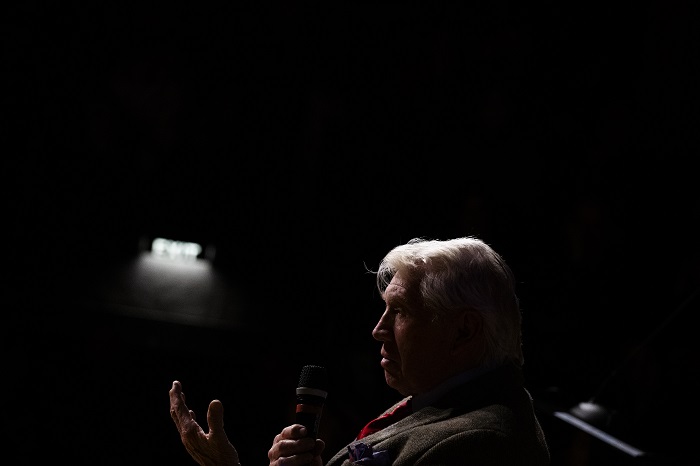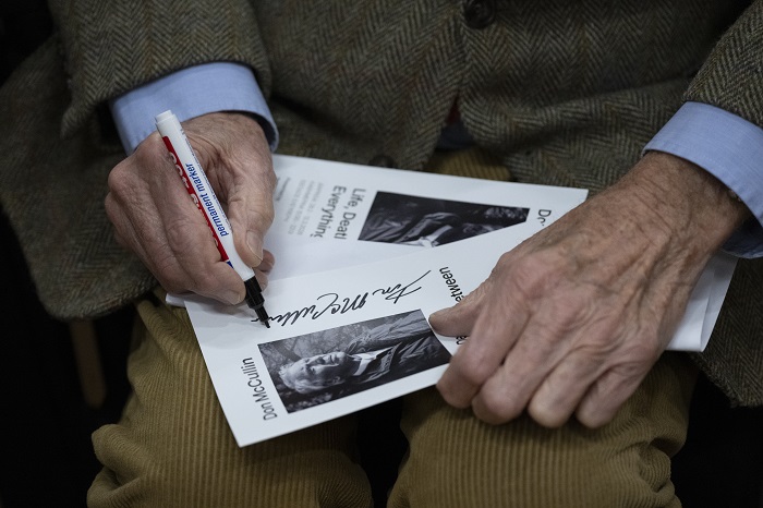 Ο Sir Don McCullin ενώ υπογράφει το φυλλάδιο της έκθεσης για έναν από τους επισκέπτες του διημέρου των Ψηφιακών Προβολών του Athens Photo World στο Αμφιθέατρο Μιλτιάδης Έβερτ στην Τεχνόπολη του Δήμου Αθηναίων