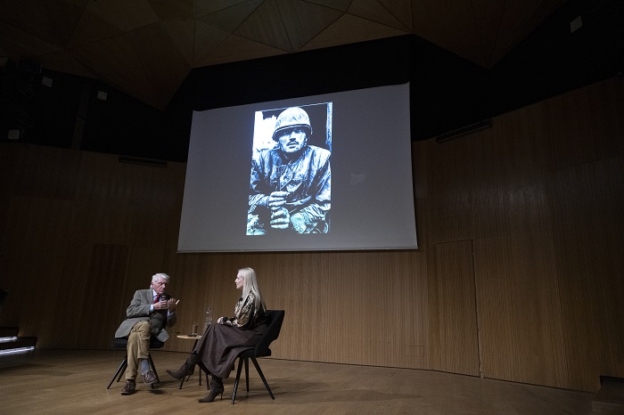Ο Don McCullin και η Χριστίνα κατά την συζήτηση στο αμφιθέατρο Μιλτιάδης Έβερτ, το Σάββατο, 28 Φεβρουαρίου 2026, ενώ στην οθόνη εμφανίζεται μία από τις εμβληματικότερες φωτογραφίες του, ο Στρατιώτης που έχει υποστεί σοκ κατά την μάχη της Χουέ, στο Βιετνάμ το 1968