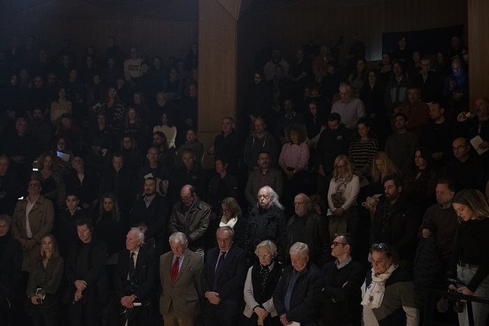 Το κατάμεστο αμφιθέατρο Μιλτιάδης Έβερτ, το Σάββατο, 28 Φεβρουαρίου 2026, κρατάει ενός λεπτού σιγή στην μνήμη των νεκρών του της τραγωδίας των Τεμπών