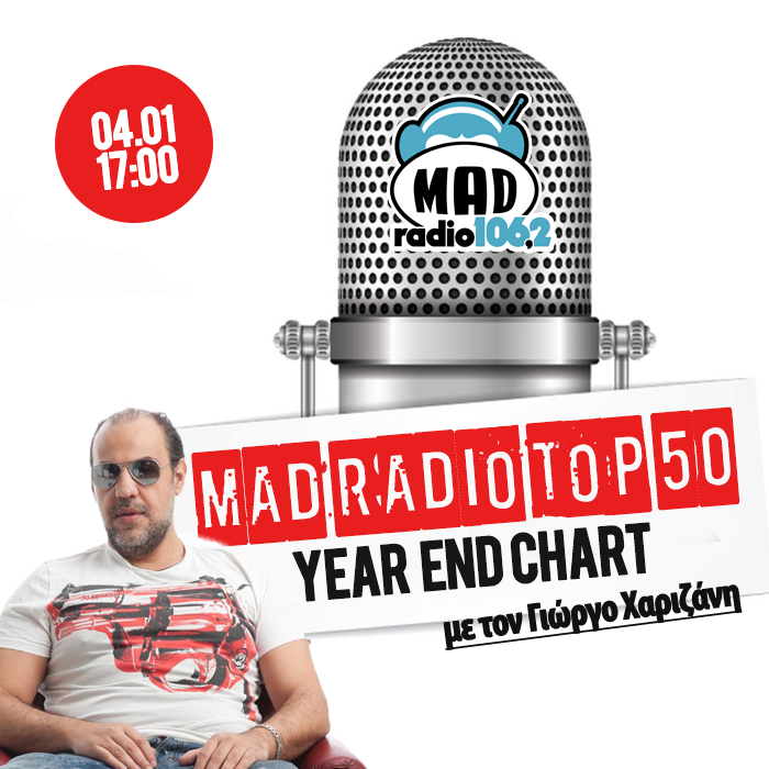 Συντονιστείτε την Δευτέρα 04.01 στις 17:00 και απολαύστε μία τετράωρη live εκπομπή με τον Γιώργο Χαριζάνη. Όλες οι πληροφορίες και οι θέσεις των 50 μεγαλύτερων επιτυχιών που έπαιξαν στο Mad Radio 106.2 την χρονιά που μας πέρασε!